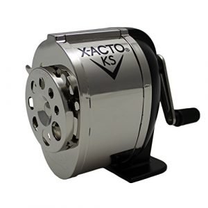 But if that’s not your style, I also use a fully electric pencil sharpener.  Get one with different size holes so you can sharpen colored pencils and odd sizes.  I also recommend one that has a large disposal bin so you don’t have to change it every three seconds.  You will want one that plugs into the wall, not a battery operated only model.  They don’t have enough power and you will be changing batteries all the time.