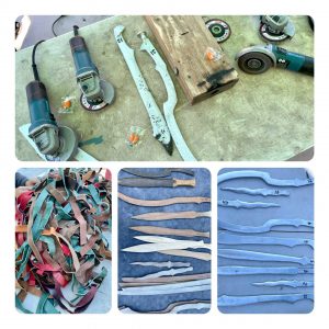 Once these are ground and polished, your child will get to put a leather bound strap on them for additional hand safety and authenticity. One of the things I appreciated most is that all of his materials are made from recycled materials. He uses old couches for the leather and recycled scrap metal for the swords. It’s a brilliant use of upcycling.